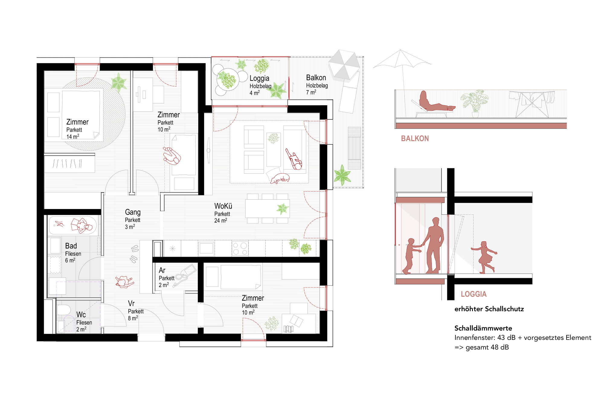 Das Projekt „Purpurgrünes Wohnen“ nutzt den Bauplatz an der Wienzeile in ausgewogener Weise: Zwei Baukörper – einer entlang der Wienzeile als gekuppeltes Haus, einer im Gartenbereich als freistehendes Punkthaus – ermöglichen eine ideale Realteilung in zwei Parzellen. Diese Konfiguration schafft einen lebendigen und doch ruhigen Zwischenraum, der als gut proportionierter Nachbarschaftshof Synergien zwischen denbeiden Gebäuden bietet.